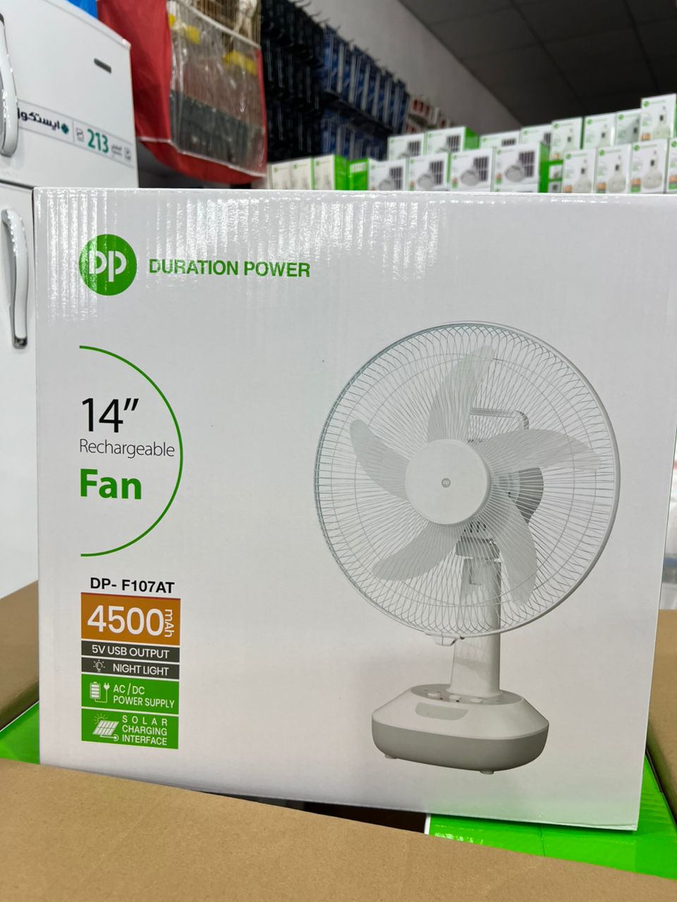 این تصویر یک پنکه شارژی ۱۴ اینچی با نام تجاری "DURATION POWER" و مدل "DP-F107AT" را نشان میدهد.
